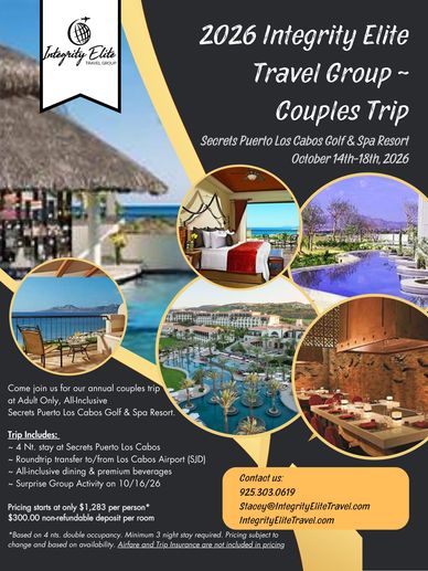 Join us for an unforgettable romantic escape hosted by Integrity Elite Travel, designed exclusively for couples seeking relaxation, connection, and upscale fun in beautiful Los Cabos.