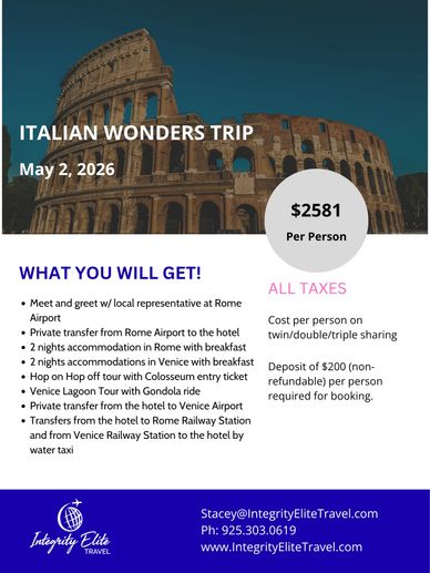Experience the romance, history, and breathtaking beauty of Italy on this perfectly curated 4-city journey through Rome and Venice. Begin with a warm meet-and-greet at Rome Airport before enjoying your private transfer to your hotel for a relaxing 2-night stay with breakfast. Explore Rome at your own pace with a Hop-On Hop-Off tour and priority entry to the legendary Colosseum. Then travel north by rail to enchanting Venice, where you’ll enjoy 2 nights of canal-side charm, daily breakfast, a scenic lagoon tour, and an unforgettable gondola ride through the city’s iconic waterways.