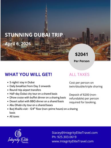 This incredible package is just $2,041 per person (double occupancy) with a $200 non-refundable deposit to secure your spot. Dubai awaits—click to book your adventure!